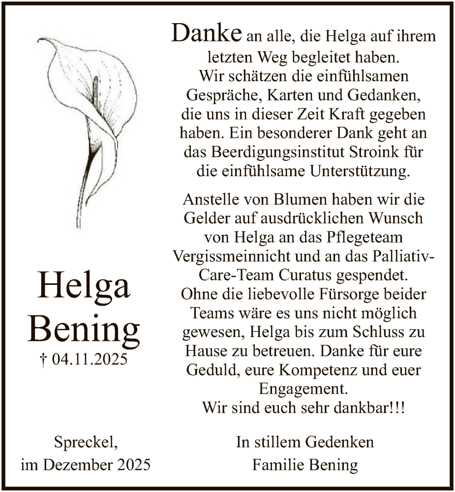 Hier finden Sie alle Traueranzeigen aus der Zeitung, die bisher für Helga Bening erschienen sind. Weitere Traueranzeigen, die in der Zeitung erscheinen, werden hier ebenfalls aufgelistet
