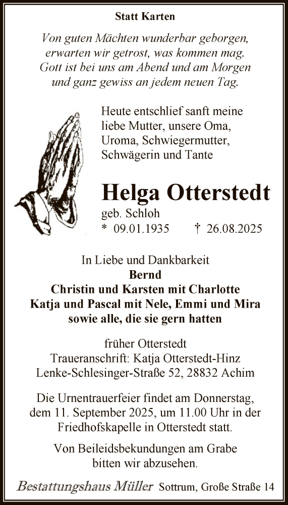 Hier finden Sie alle Traueranzeigen aus der Zeitung, die bisher für Helga Otterstedt erschienen sind. Weitere Traueranzeigen, die in der Zeitung erscheinen, werden hier ebenfalls aufgelistet