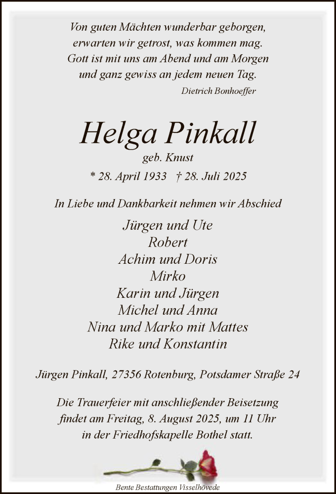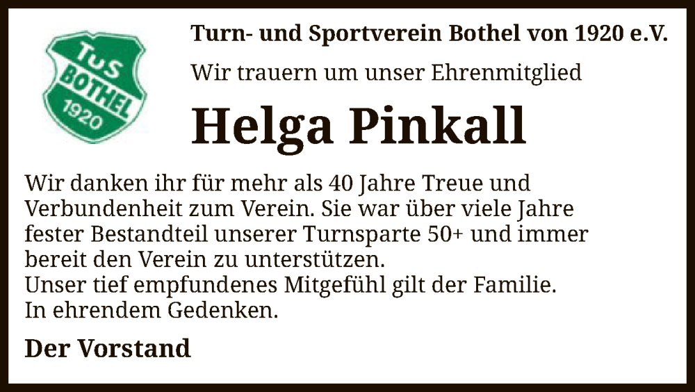 Hier finden Sie alle Traueranzeigen aus der Zeitung, die bisher für Helga Pinkall erschienen sind. Weitere Traueranzeigen, die in der Zeitung erscheinen, werden hier ebenfalls aufgelistet