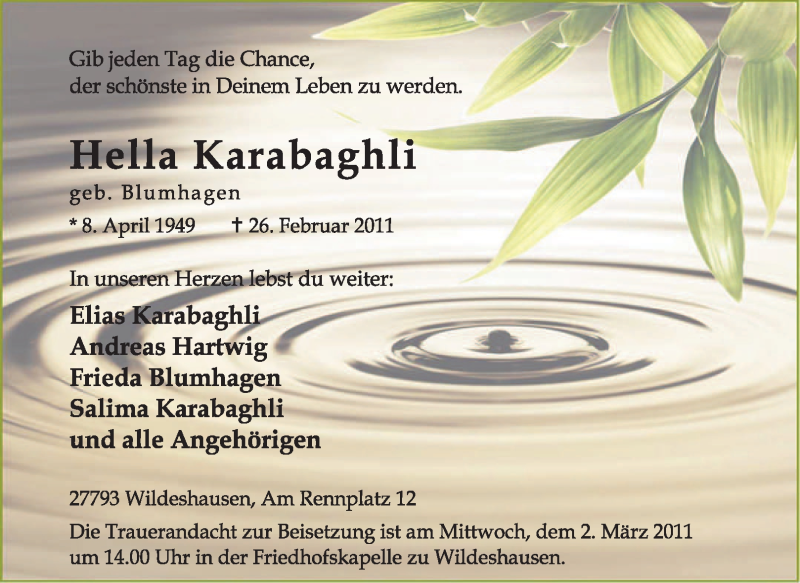 Hier finden Sie alle Traueranzeigen aus der Zeitung, die bisher für Hella Karabaghli erschienen sind. Weitere Traueranzeigen, die in der Zeitung erscheinen, werden hier ebenfalls aufgelistet