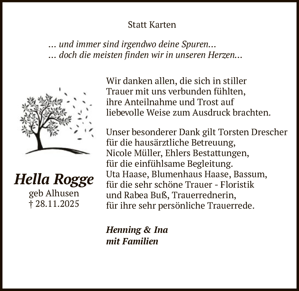 Hier finden Sie alle Traueranzeigen aus der Zeitung, die bisher für Hella Rogge erschienen sind. Weitere Traueranzeigen, die in der Zeitung erscheinen, werden hier ebenfalls aufgelistet