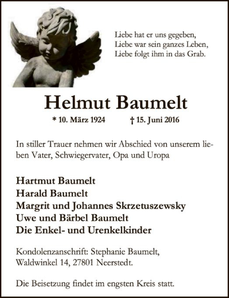 Hier finden Sie alle Traueranzeigen aus der Zeitung, die bisher für Helmut Baumelt erschienen sind. Weitere Traueranzeigen, die in der Zeitung erscheinen, werden hier ebenfalls aufgelistet