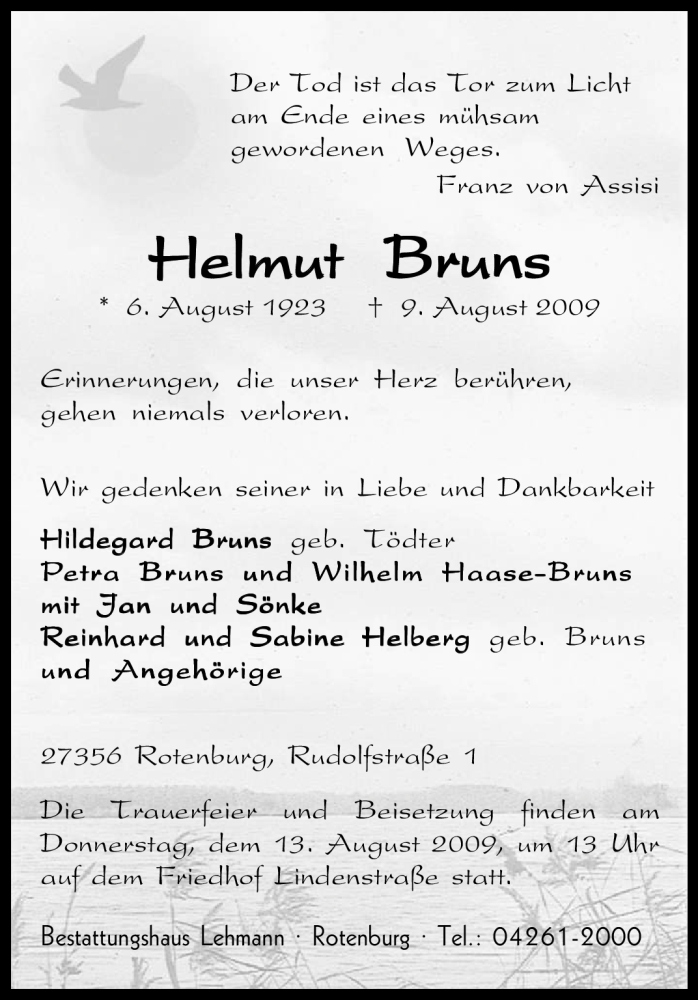 Hier finden Sie alle Traueranzeigen aus der Zeitung, die bisher für Helmut Bruns erschienen sind. Weitere Traueranzeigen, die in der Zeitung erscheinen, werden hier ebenfalls aufgelistet