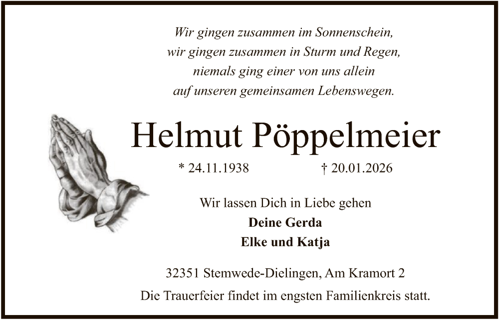 Hier finden Sie alle Traueranzeigen aus der Zeitung, die bisher für Helmut Pöppelmeier erschienen sind. Weitere Traueranzeigen, die in der Zeitung erscheinen, werden hier ebenfalls aufgelistet