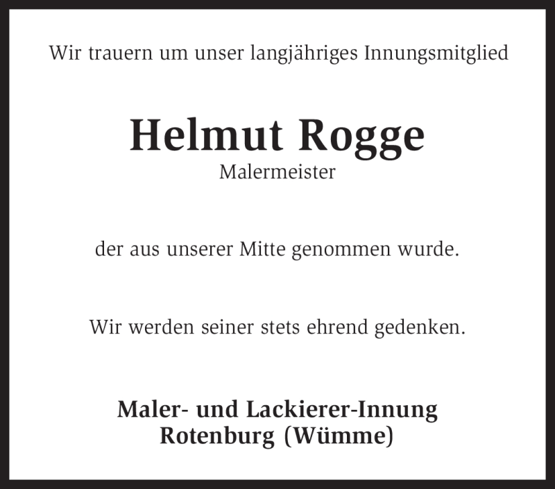 Hier finden Sie alle Traueranzeigen aus der Zeitung, die bisher für Helmut Rogge erschienen sind. Weitere Traueranzeigen, die in der Zeitung erscheinen, werden hier ebenfalls aufgelistet