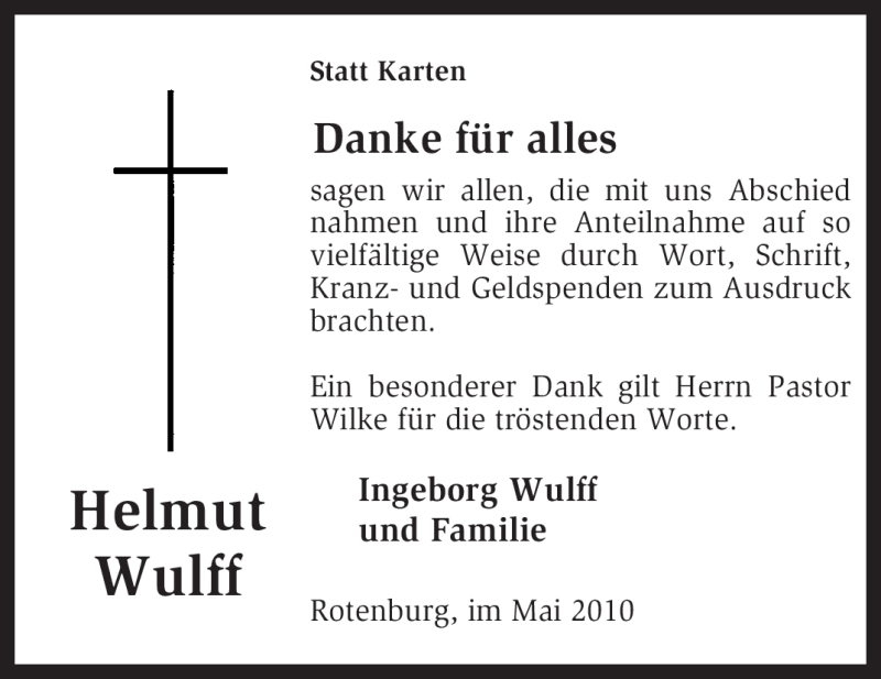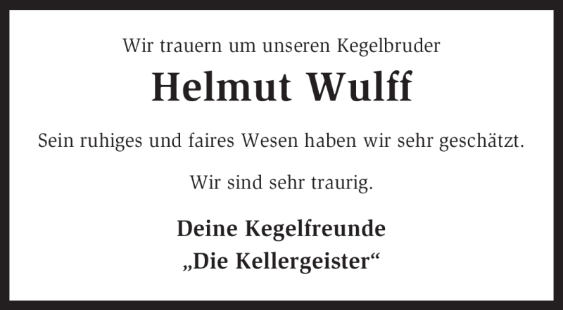 Hier finden Sie alle Traueranzeigen aus der Zeitung, die bisher für Helmut Wulff erschienen sind. Weitere Traueranzeigen, die in der Zeitung erscheinen, werden hier ebenfalls aufgelistet