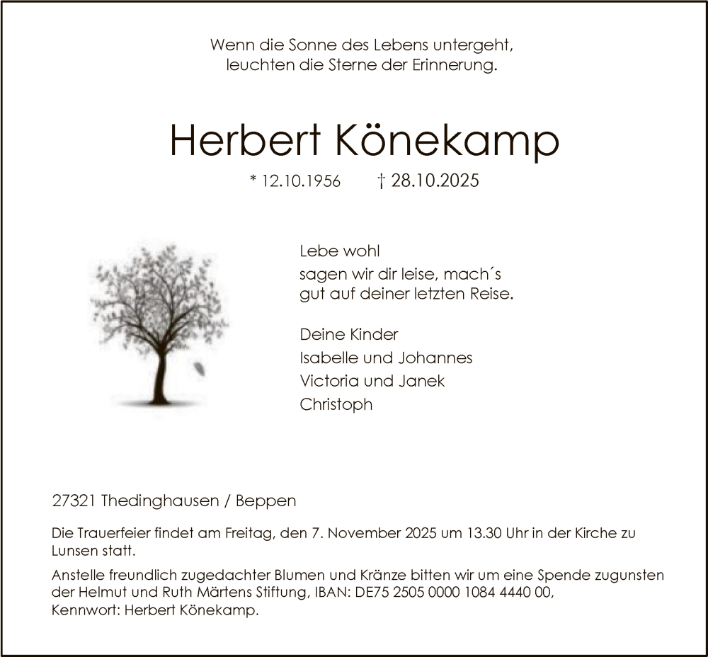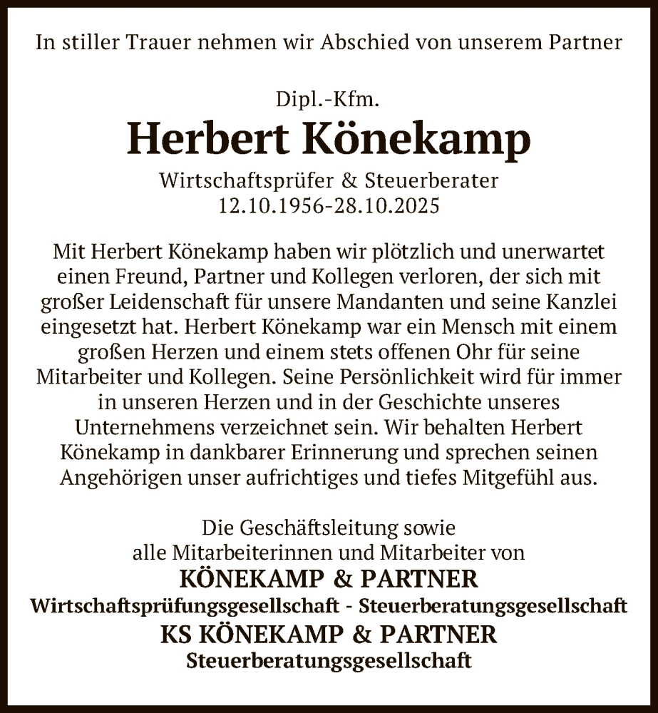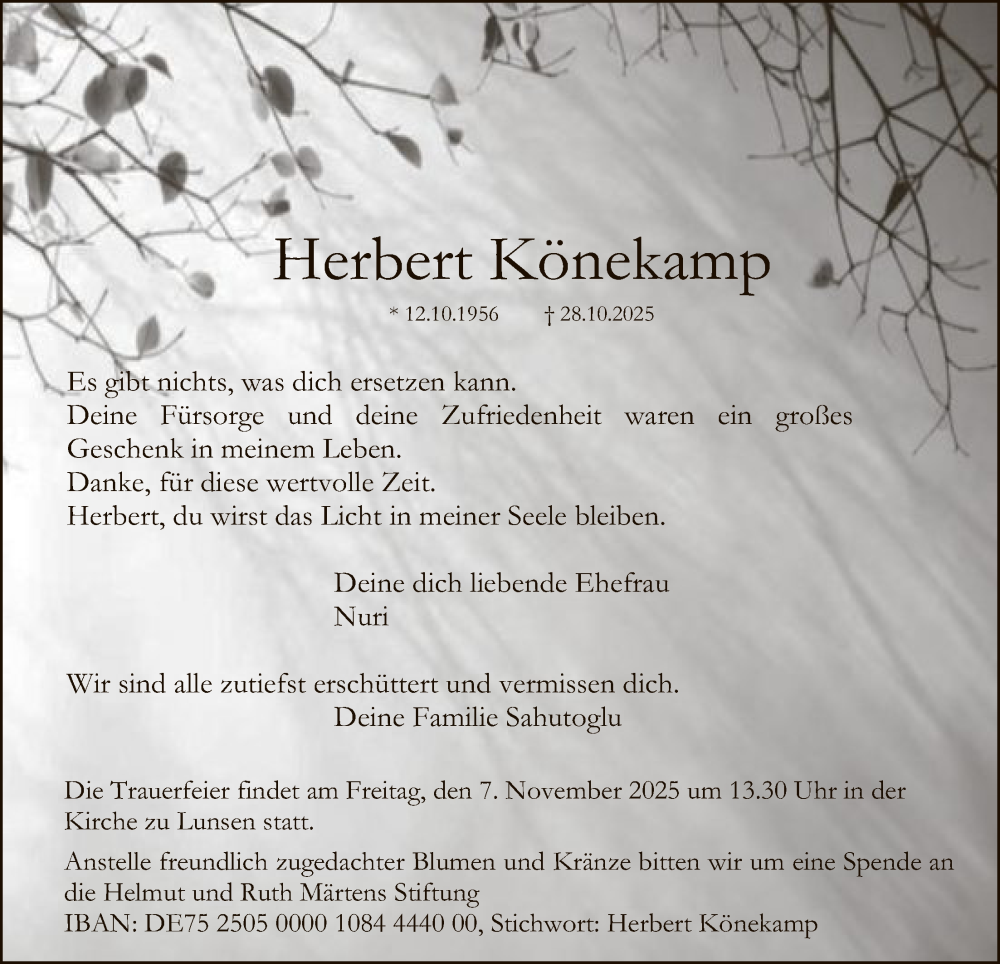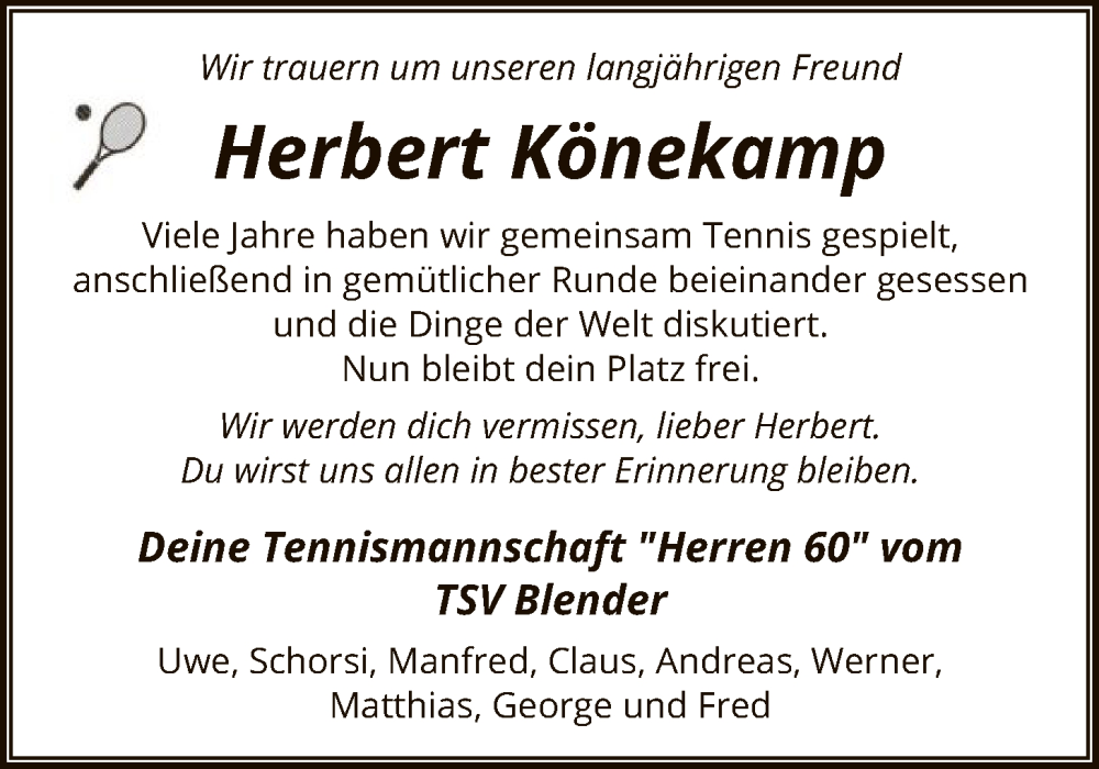 Hier finden Sie alle Traueranzeigen aus der Zeitung, die bisher für Herbert Könekamp erschienen sind. Weitere Traueranzeigen, die in der Zeitung erscheinen, werden hier ebenfalls aufgelistet