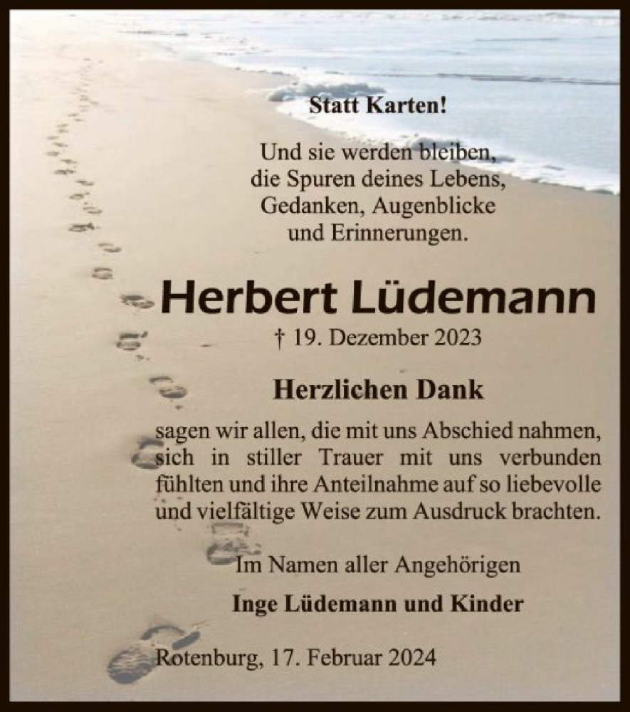 Hier finden Sie alle Traueranzeigen aus der Zeitung, die bisher für Herbert Lüdemann erschienen sind. Weitere Traueranzeigen, die in der Zeitung erscheinen, werden hier ebenfalls aufgelistet