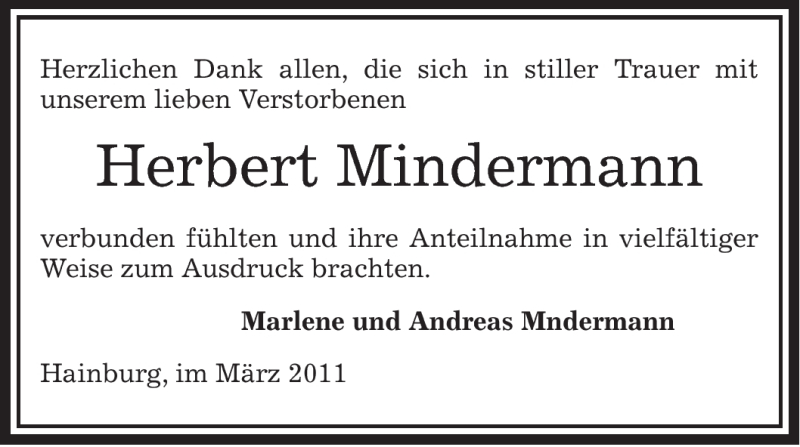 Hier finden Sie alle Traueranzeigen aus der Zeitung, die bisher für Herbert Mindermann erschienen sind. Weitere Traueranzeigen, die in der Zeitung erscheinen, werden hier ebenfalls aufgelistet