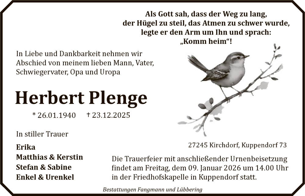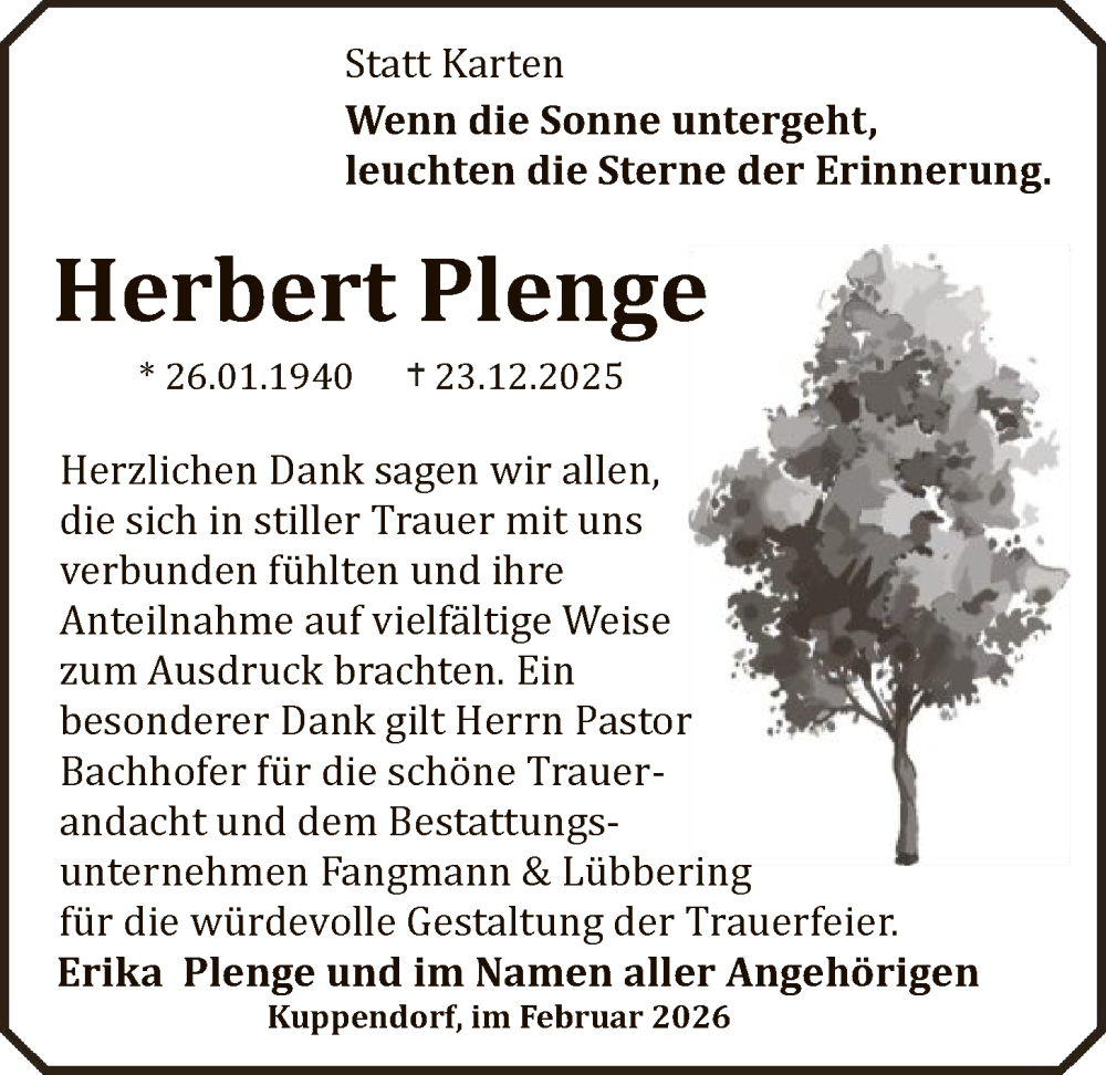 Hier finden Sie alle Traueranzeigen aus der Zeitung, die bisher für Herbert Plenge erschienen sind. Weitere Traueranzeigen, die in der Zeitung erscheinen, werden hier ebenfalls aufgelistet