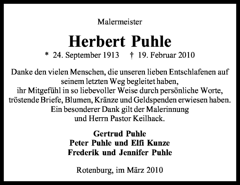 Hier finden Sie alle Traueranzeigen aus der Zeitung, die bisher für Herbert Puhle erschienen sind. Weitere Traueranzeigen, die in der Zeitung erscheinen, werden hier ebenfalls aufgelistet