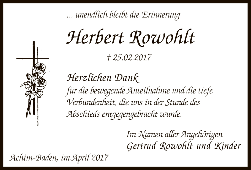 Hier finden Sie alle Traueranzeigen aus der Zeitung, die bisher für Herbert Rowohlt erschienen sind. Weitere Traueranzeigen, die in der Zeitung erscheinen, werden hier ebenfalls aufgelistet