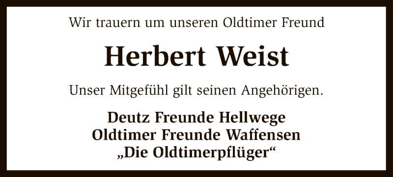 Hier finden Sie alle Traueranzeigen aus der Zeitung, die bisher für Herbert Weist erschienen sind. Weitere Traueranzeigen, die in der Zeitung erscheinen, werden hier ebenfalls aufgelistet