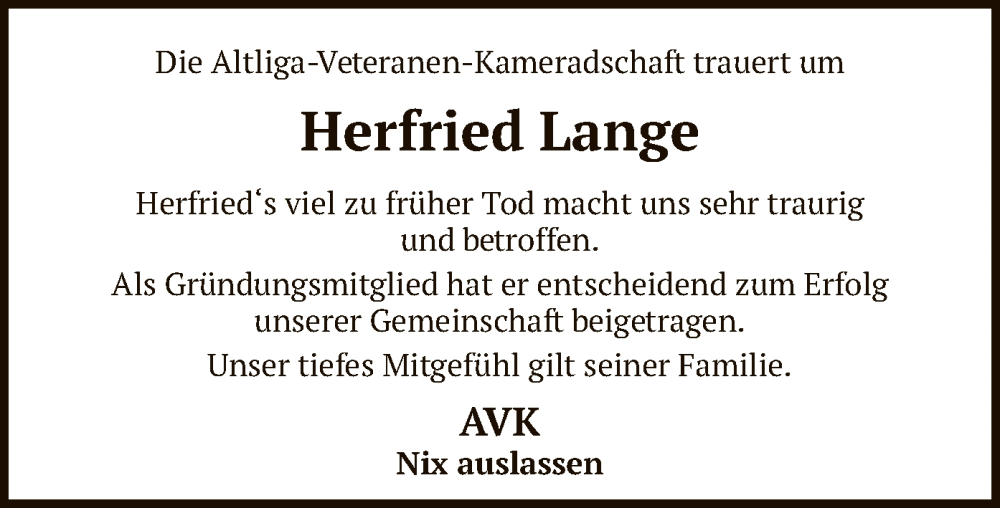 Hier finden Sie alle Traueranzeigen aus der Zeitung, die bisher für Herfried Lange erschienen sind. Weitere Traueranzeigen, die in der Zeitung erscheinen, werden hier ebenfalls aufgelistet