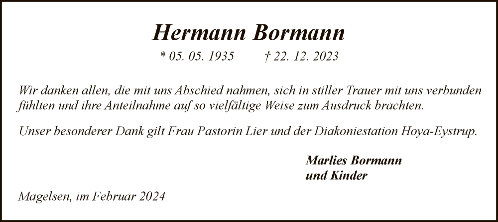 Hier finden Sie alle Traueranzeigen aus der Zeitung, die bisher für Hermann Bormann erschienen sind. Weitere Traueranzeigen, die in der Zeitung erscheinen, werden hier ebenfalls aufgelistet