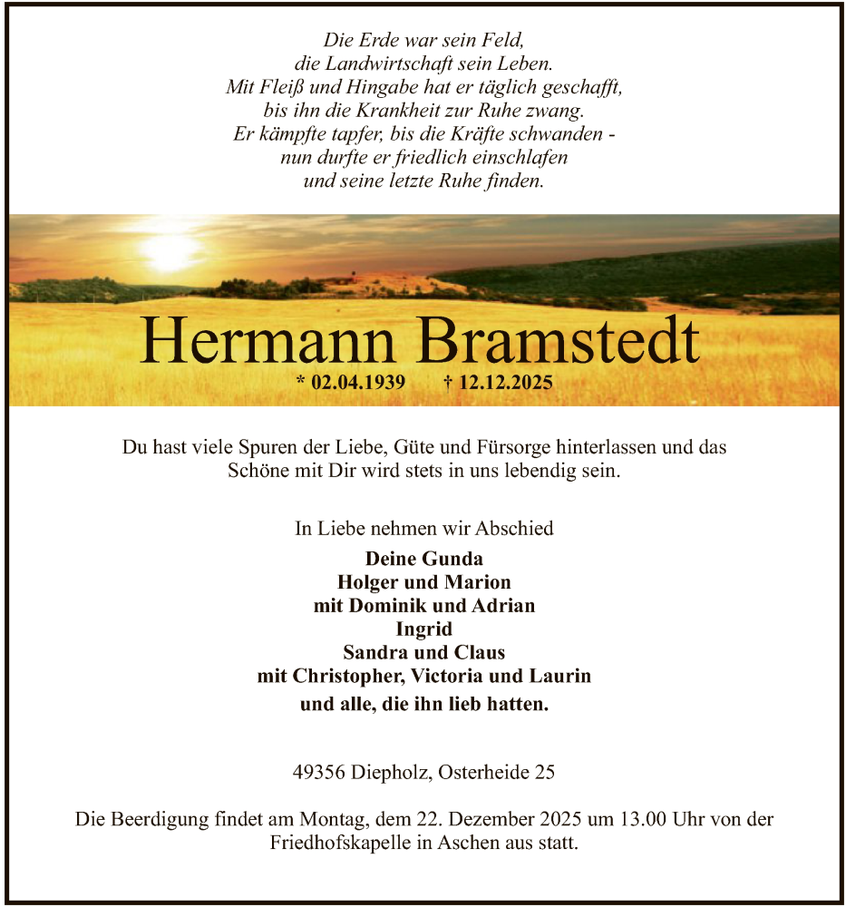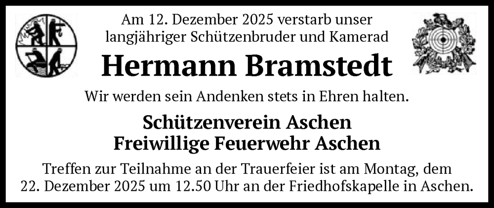 Hier finden Sie alle Traueranzeigen aus der Zeitung, die bisher für Hermann Bramstedt erschienen sind. Weitere Traueranzeigen, die in der Zeitung erscheinen, werden hier ebenfalls aufgelistet