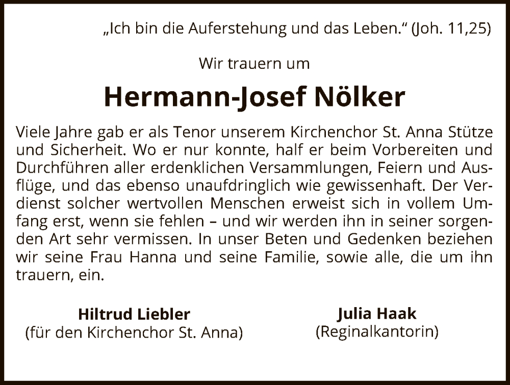 Hier finden Sie alle Traueranzeigen aus der Zeitung, die bisher für Hermann-Josef Nölker erschienen sind. Weitere Traueranzeigen, die in der Zeitung erscheinen, werden hier ebenfalls aufgelistet