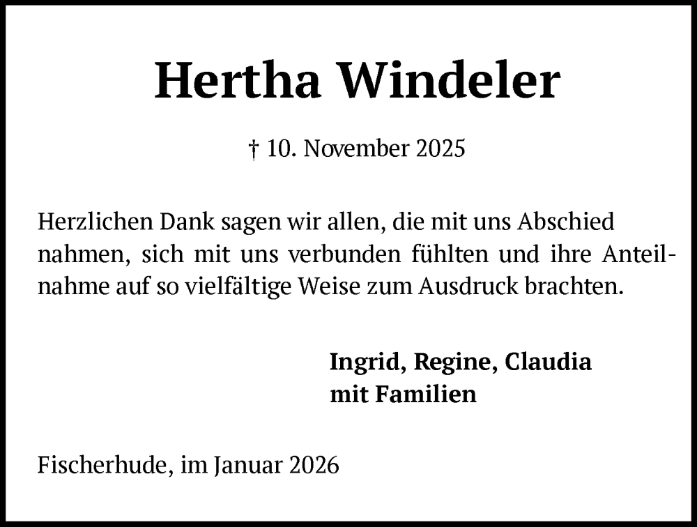 Hier finden Sie alle Traueranzeigen aus der Zeitung, die bisher für Hertha Windeler erschienen sind. Weitere Traueranzeigen, die in der Zeitung erscheinen, werden hier ebenfalls aufgelistet