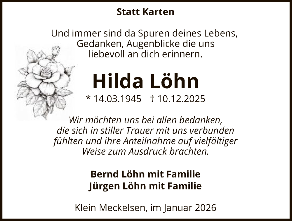 Hier finden Sie alle Traueranzeigen aus der Zeitung, die bisher für Hilda Löhn erschienen sind. Weitere Traueranzeigen, die in der Zeitung erscheinen, werden hier ebenfalls aufgelistet