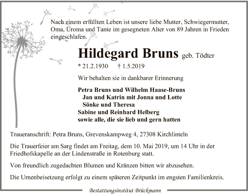 Hier finden Sie alle Traueranzeigen aus der Zeitung, die bisher für Hildegard Bruns erschienen sind. Weitere Traueranzeigen, die in der Zeitung erscheinen, werden hier ebenfalls aufgelistet