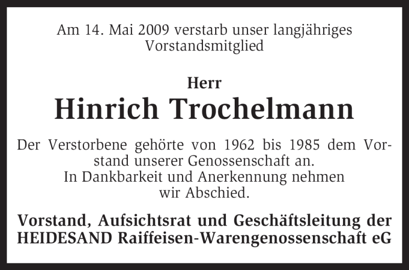 Hier finden Sie alle Traueranzeigen aus der Zeitung, die bisher für Hinrich Trochelmann erschienen sind. Weitere Traueranzeigen, die in der Zeitung erscheinen, werden hier ebenfalls aufgelistet