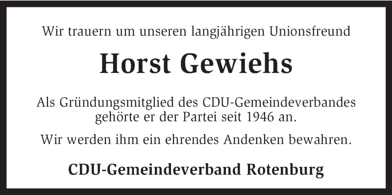 Hier finden Sie alle Traueranzeigen aus der Zeitung, die bisher für Horst Gewiehs erschienen sind. Weitere Traueranzeigen, die in der Zeitung erscheinen, werden hier ebenfalls aufgelistet