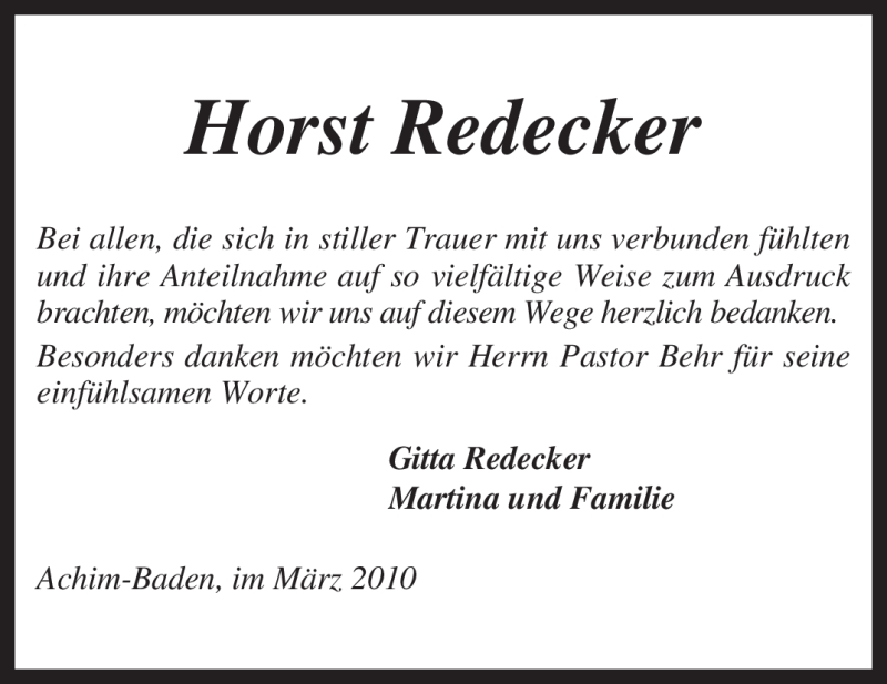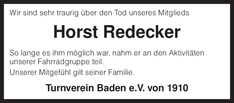 Hier finden Sie alle Traueranzeigen aus der Zeitung, die bisher für Horst Redecker erschienen sind. Weitere Traueranzeigen, die in der Zeitung erscheinen, werden hier ebenfalls aufgelistet