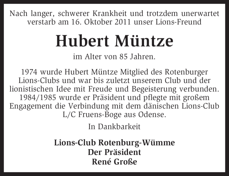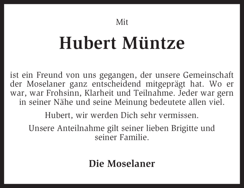 Hier finden Sie alle Traueranzeigen aus der Zeitung, die bisher für Hubert Müntze erschienen sind. Weitere Traueranzeigen, die in der Zeitung erscheinen, werden hier ebenfalls aufgelistet
