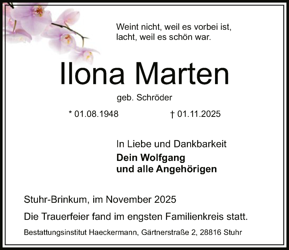 Hier finden Sie alle Traueranzeigen aus der Zeitung, die bisher für Ilona Marten erschienen sind. Weitere Traueranzeigen, die in der Zeitung erscheinen, werden hier ebenfalls aufgelistet