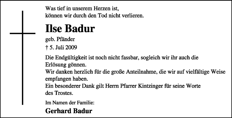 Hier finden Sie alle Traueranzeigen aus der Zeitung, die bisher für Ilse Badur erschienen sind. Weitere Traueranzeigen, die in der Zeitung erscheinen, werden hier ebenfalls aufgelistet
