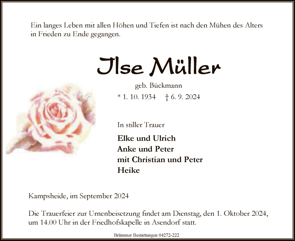 Hier finden Sie alle Traueranzeigen aus der Zeitung, die bisher für Ilse Müller erschienen sind. Weitere Traueranzeigen, die in der Zeitung erscheinen, werden hier ebenfalls aufgelistet