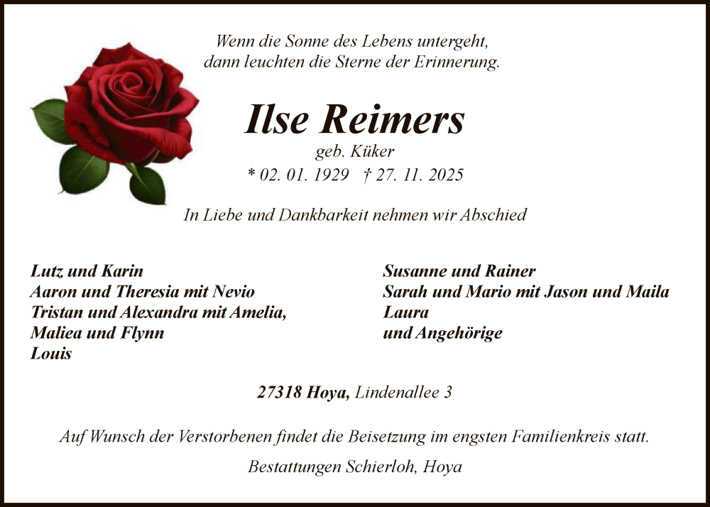 Hier finden Sie alle Traueranzeigen aus der Zeitung, die bisher für Ilse Reimers erschienen sind. Weitere Traueranzeigen, die in der Zeitung erscheinen, werden hier ebenfalls aufgelistet