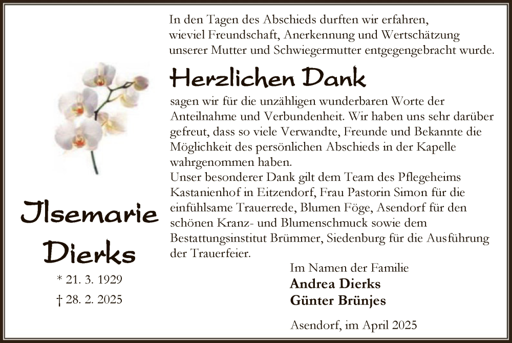 Hier finden Sie alle Traueranzeigen aus der Zeitung, die bisher für Ilsemarie Dierks erschienen sind. Weitere Traueranzeigen, die in der Zeitung erscheinen, werden hier ebenfalls aufgelistet