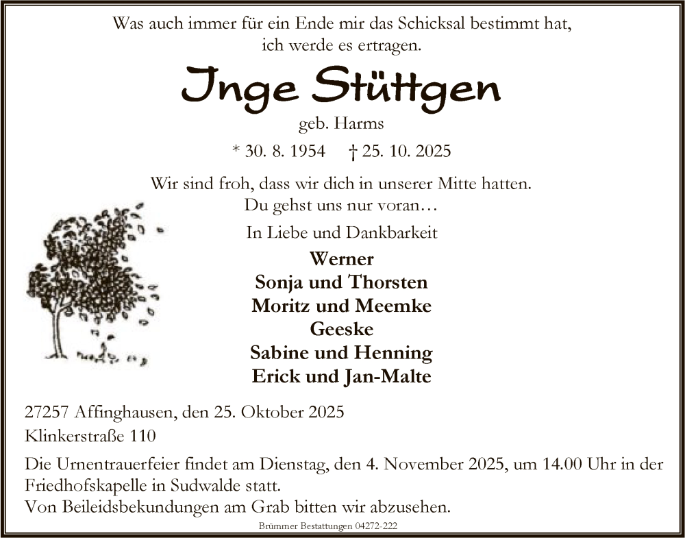 Hier finden Sie alle Traueranzeigen aus der Zeitung, die bisher für Inge Stüttgen erschienen sind. Weitere Traueranzeigen, die in der Zeitung erscheinen, werden hier ebenfalls aufgelistet