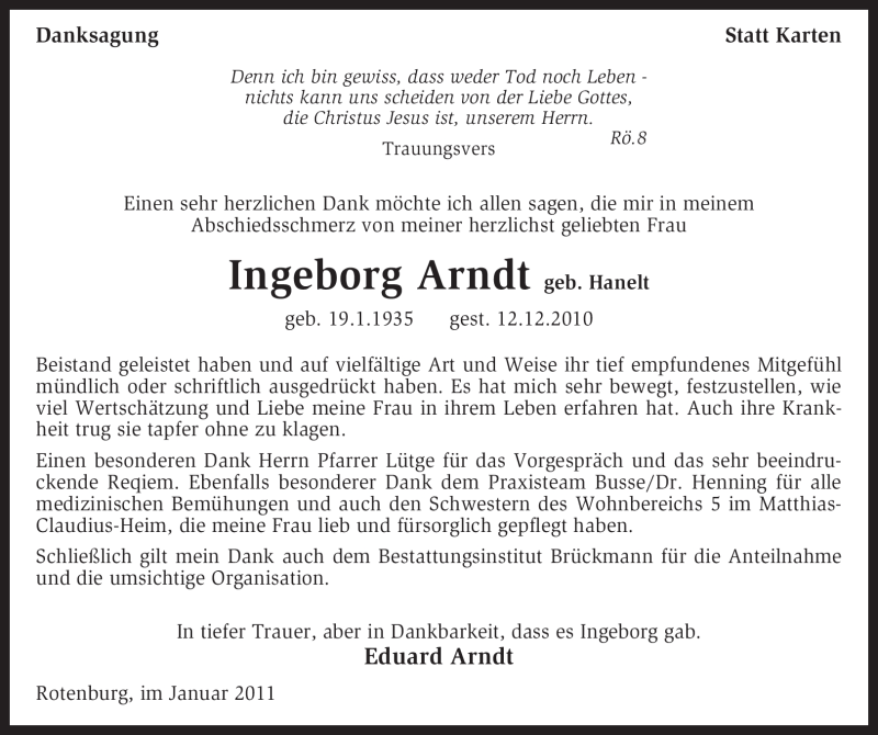 Hier finden Sie alle Traueranzeigen aus der Zeitung, die bisher für Ingeborg Arndt erschienen sind. Weitere Traueranzeigen, die in der Zeitung erscheinen, werden hier ebenfalls aufgelistet