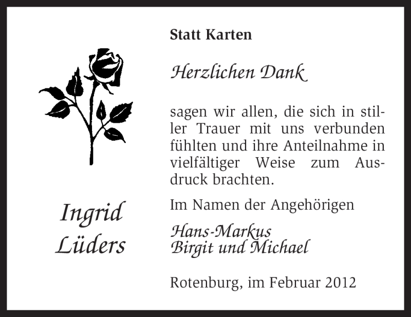 Hier finden Sie alle Traueranzeigen aus der Zeitung, die bisher für Ingrid Lüders erschienen sind. Weitere Traueranzeigen, die in der Zeitung erscheinen, werden hier ebenfalls aufgelistet