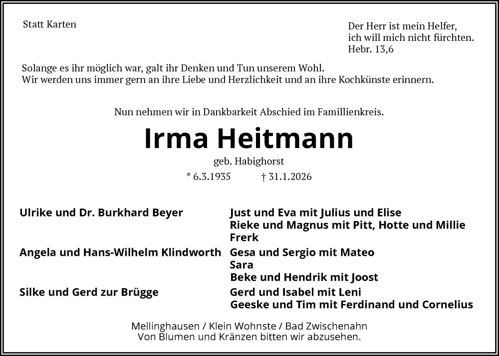 Hier finden Sie alle Traueranzeigen aus der Zeitung, die bisher für Irma Heitmann erschienen sind. Weitere Traueranzeigen, die in der Zeitung erscheinen, werden hier ebenfalls aufgelistet