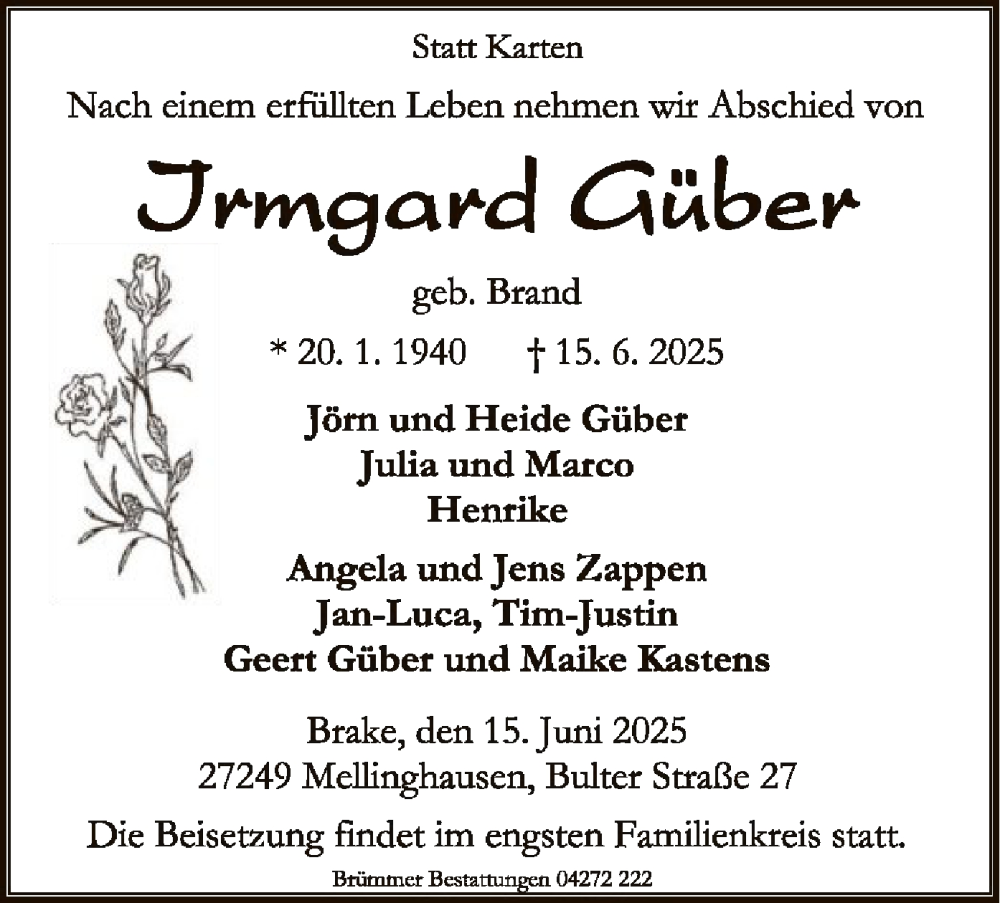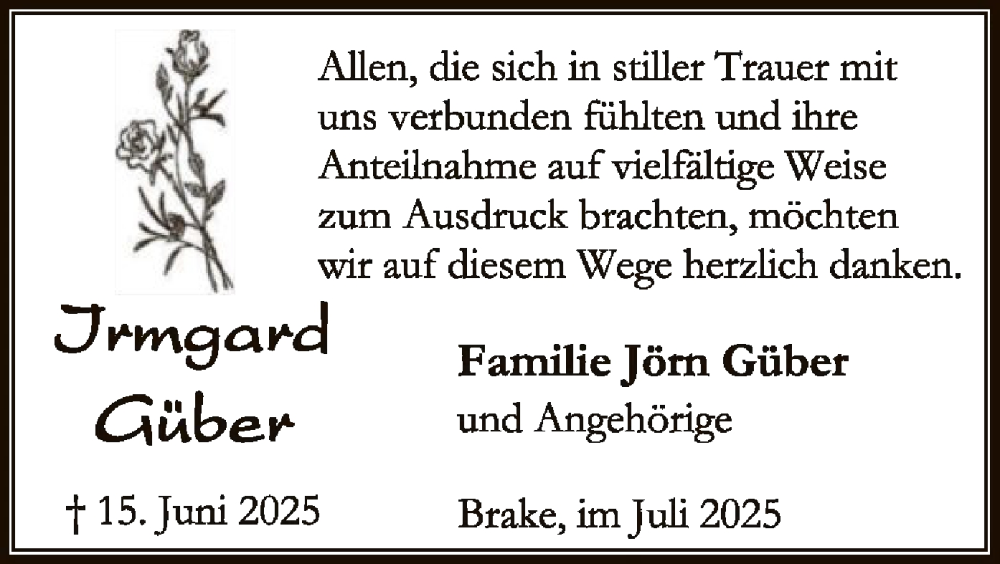 Hier finden Sie alle Traueranzeigen aus der Zeitung, die bisher für Irmgard Güber erschienen sind. Weitere Traueranzeigen, die in der Zeitung erscheinen, werden hier ebenfalls aufgelistet