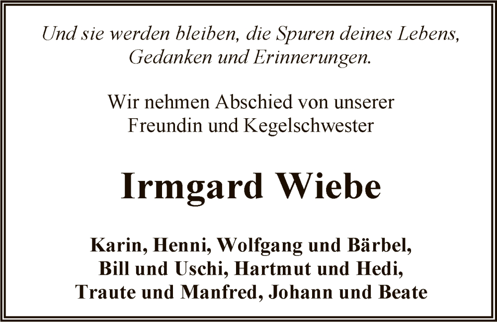 Hier finden Sie alle Traueranzeigen aus der Zeitung, die bisher für Irmgard Wiebe erschienen sind. Weitere Traueranzeigen, die in der Zeitung erscheinen, werden hier ebenfalls aufgelistet