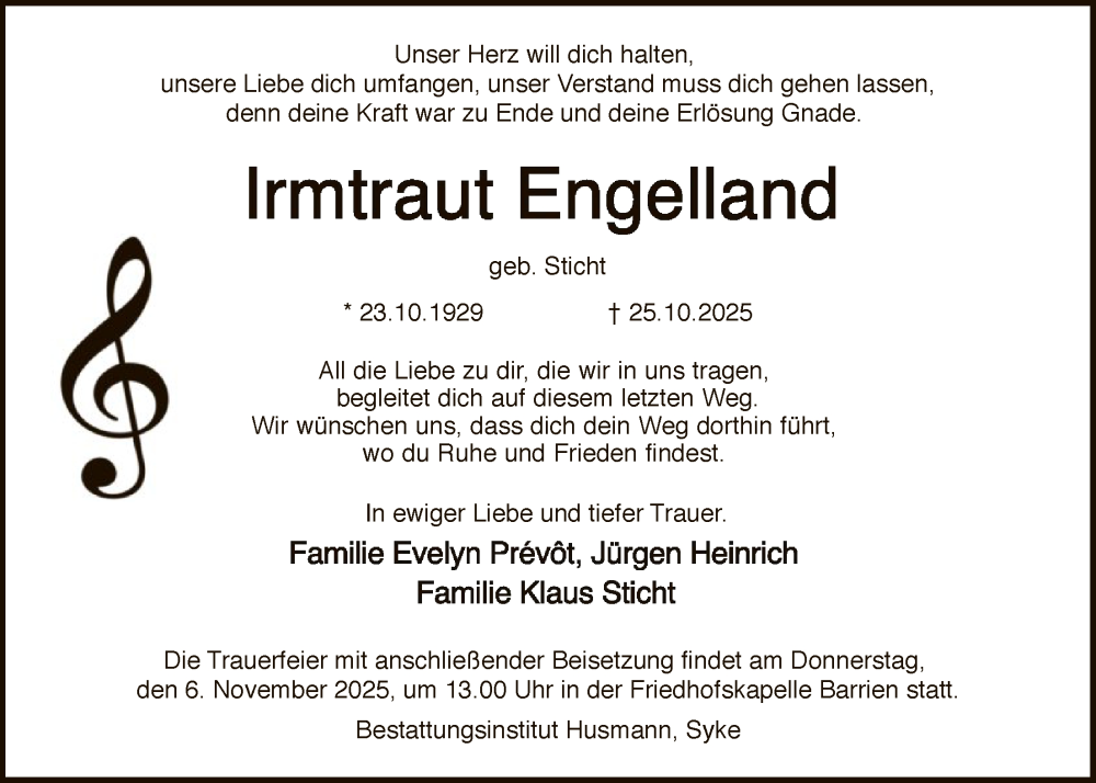 Hier finden Sie alle Traueranzeigen aus der Zeitung, die bisher für Irmtraut Engelland erschienen sind. Weitere Traueranzeigen, die in der Zeitung erscheinen, werden hier ebenfalls aufgelistet
