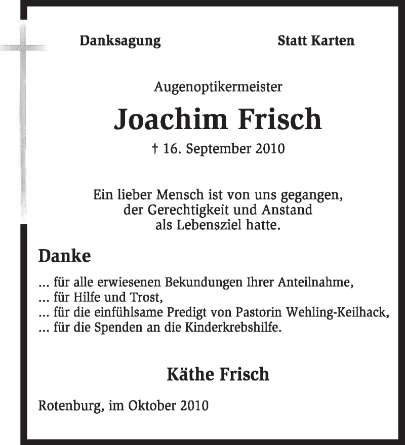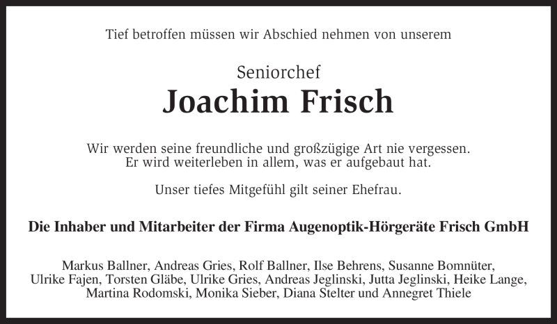Hier finden Sie alle Traueranzeigen aus der Zeitung, die bisher für Joachim Frisch erschienen sind. Weitere Traueranzeigen, die in der Zeitung erscheinen, werden hier ebenfalls aufgelistet