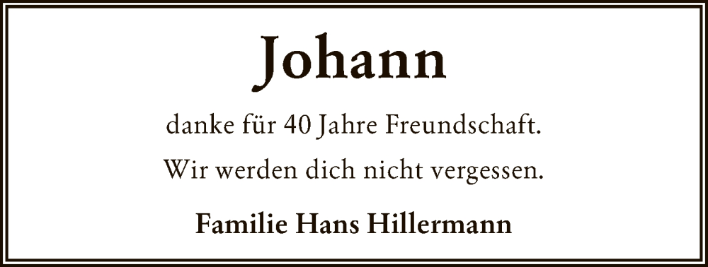 Hier finden Sie alle Traueranzeigen aus der Zeitung, die bisher für Johann erschienen sind. Weitere Traueranzeigen, die in der Zeitung erscheinen, werden hier ebenfalls aufgelistet
