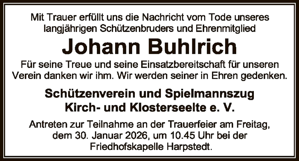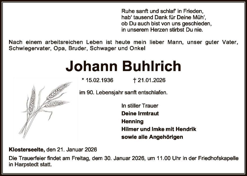 Hier finden Sie alle Traueranzeigen aus der Zeitung, die bisher für Johann Buhlrich erschienen sind. Weitere Traueranzeigen, die in der Zeitung erscheinen, werden hier ebenfalls aufgelistet