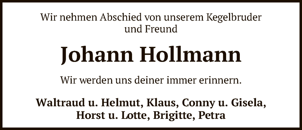 Hier finden Sie alle Traueranzeigen aus der Zeitung, die bisher für Johann Hollmann erschienen sind. Weitere Traueranzeigen, die in der Zeitung erscheinen, werden hier ebenfalls aufgelistet