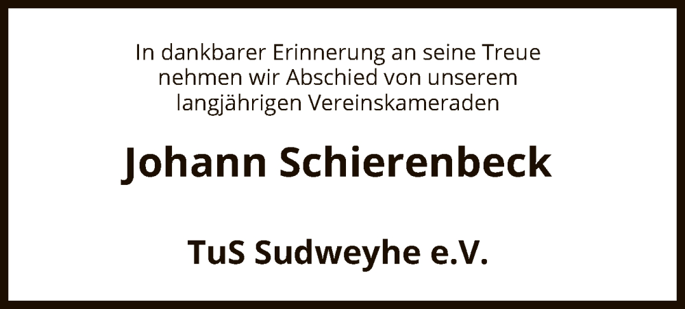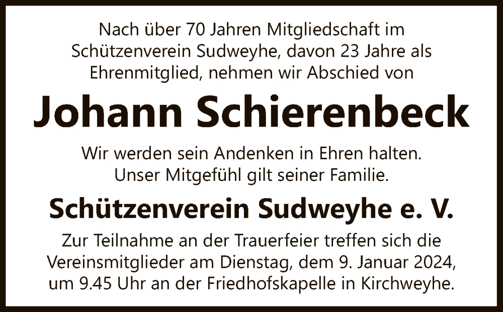 Hier finden Sie alle Traueranzeigen aus der Zeitung, die bisher für Johann Schierenbeck erschienen sind. Weitere Traueranzeigen, die in der Zeitung erscheinen, werden hier ebenfalls aufgelistet