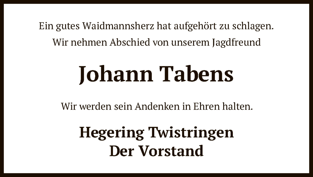Hier finden Sie alle Traueranzeigen aus der Zeitung, die bisher für Johann Tabens erschienen sind. Weitere Traueranzeigen, die in der Zeitung erscheinen, werden hier ebenfalls aufgelistet