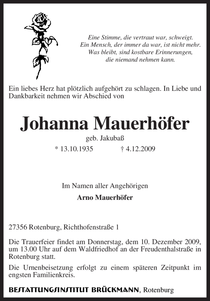 Hier finden Sie alle Traueranzeigen aus der Zeitung, die bisher für Johanna Mauerhöfer erschienen sind. Weitere Traueranzeigen, die in der Zeitung erscheinen, werden hier ebenfalls aufgelistet