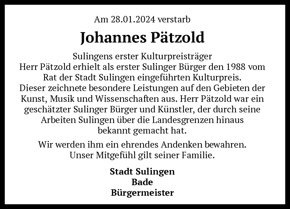 Hier finden Sie alle Traueranzeigen aus der Zeitung, die bisher für Johannes Pätzold erschienen sind. Weitere Traueranzeigen, die in der Zeitung erscheinen, werden hier ebenfalls aufgelistet