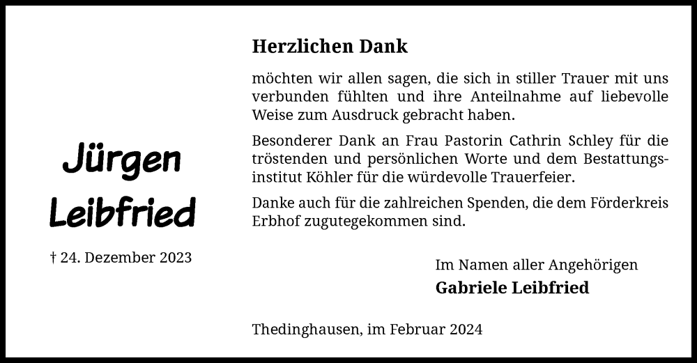Hier finden Sie alle Traueranzeigen aus der Zeitung, die bisher für Jürgen Leibfried erschienen sind. Weitere Traueranzeigen, die in der Zeitung erscheinen, werden hier ebenfalls aufgelistet