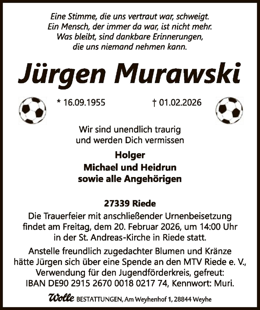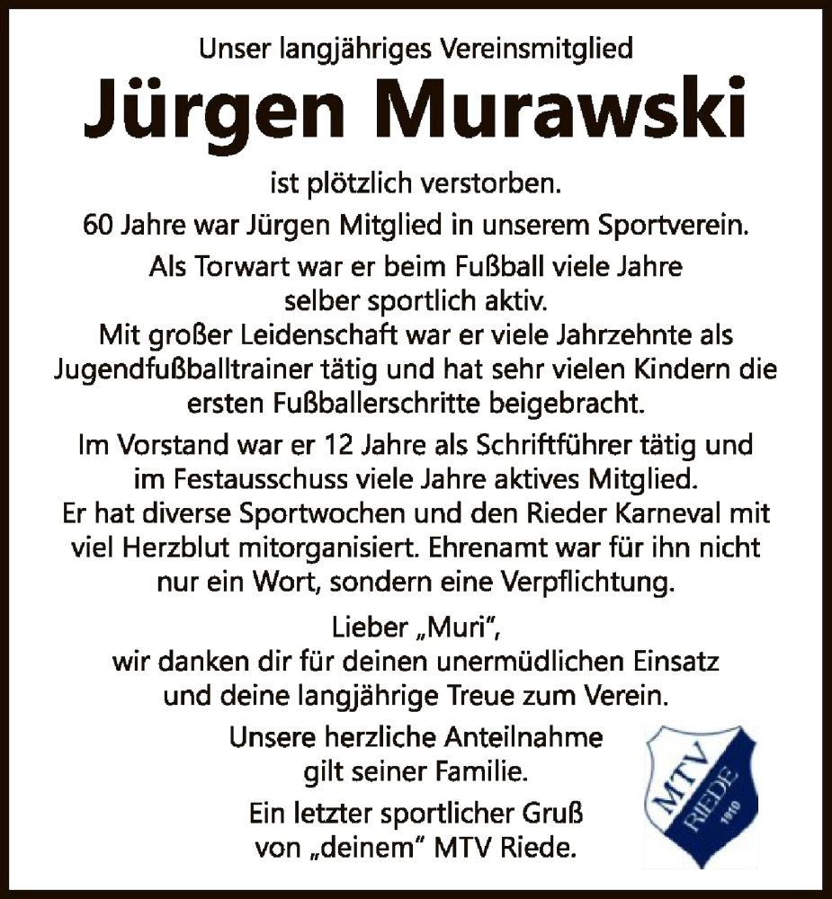 Hier finden Sie alle Traueranzeigen aus der Zeitung, die bisher für Jürgen Murawski erschienen sind. Weitere Traueranzeigen, die in der Zeitung erscheinen, werden hier ebenfalls aufgelistet